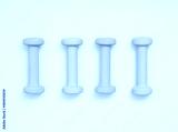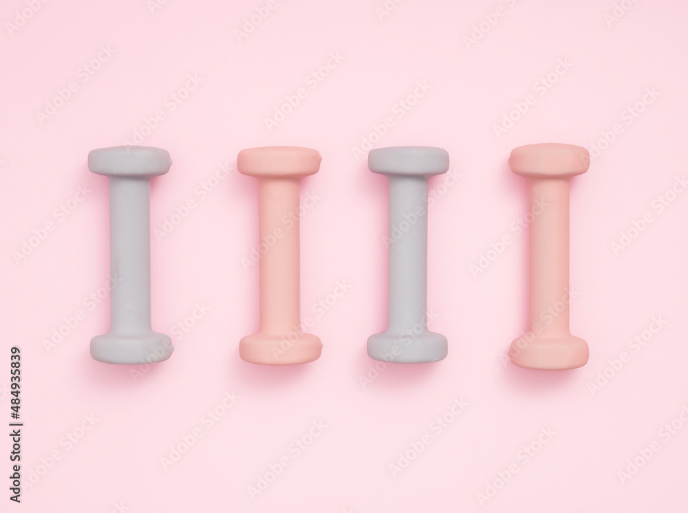 Four pastel color exercise weights on pastel pink background with soft shadow. Exercise, healty lifestyle or New Year resolution concept. Flat lay.