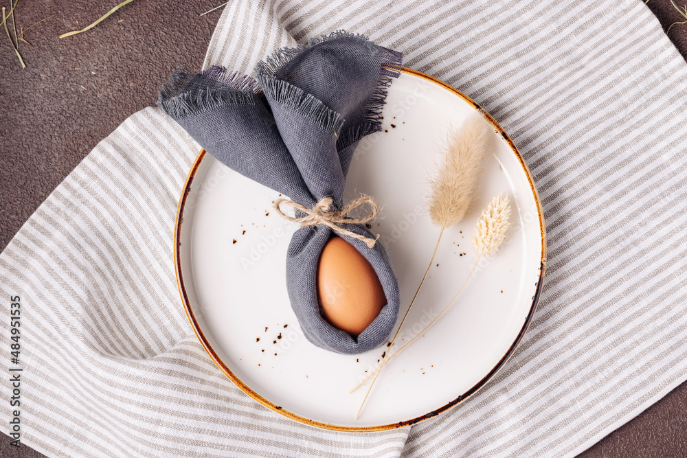 Easter egg decorated as a bunny in a white plate on a brown concrete background