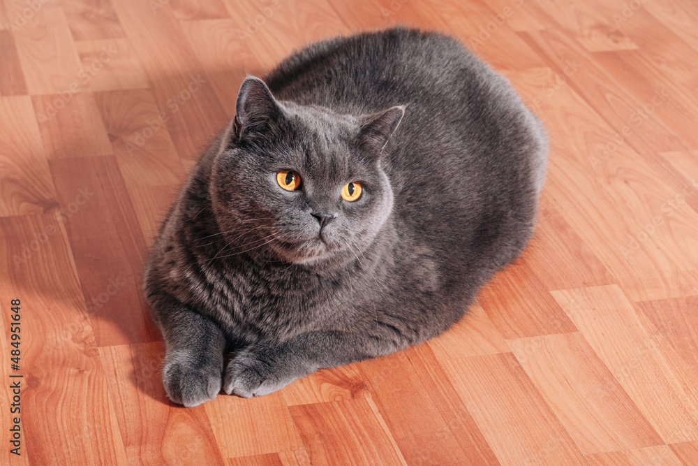 Big gray cat of the British breed sitting on the wooden floor in the apartment