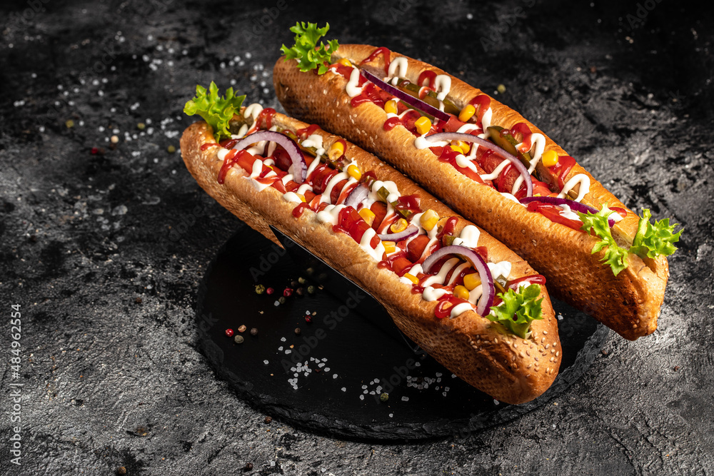 Hot dogs with different toppings on a dark background. Food background. fast food and junk food concept, Street food