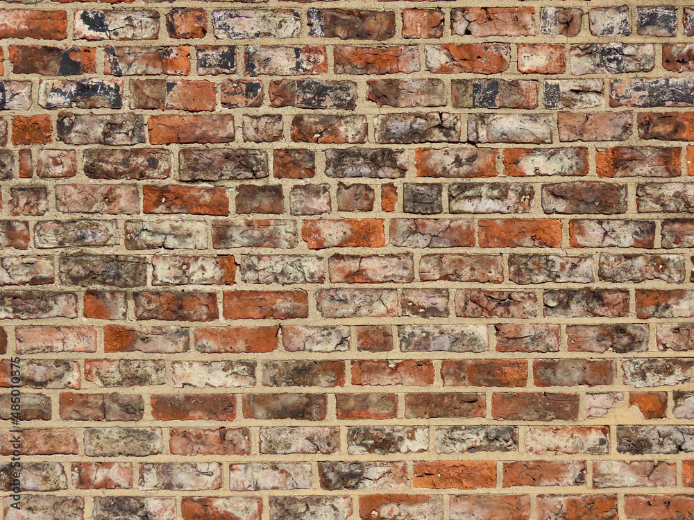 Very old red brick wall with black soot marks from fire in York, England, traditional pattern, traditional mason work