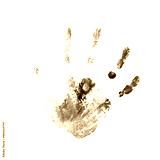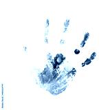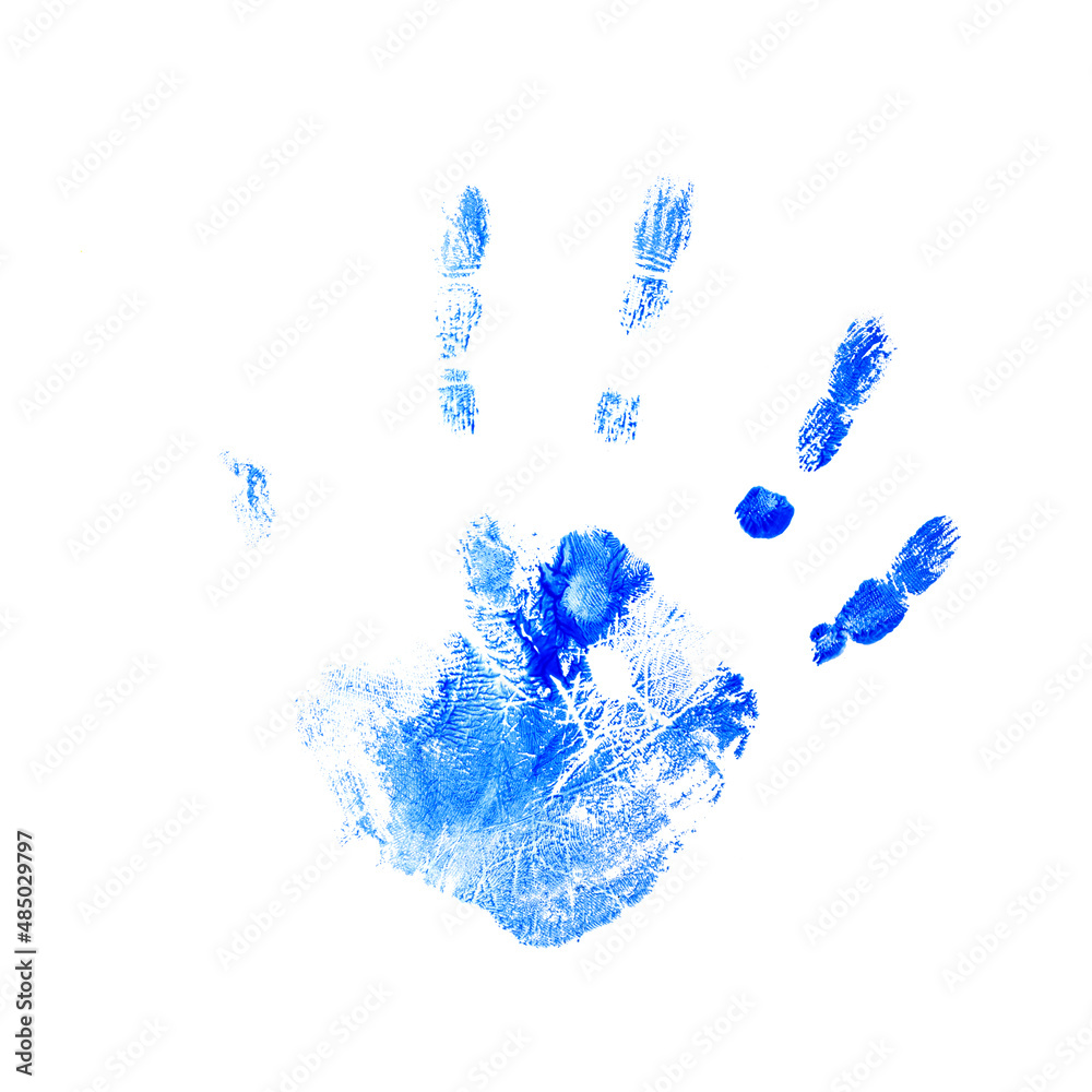 Blue hand print of a child isolated on white background. Watercolor paints. Children paint traces from hands and fingers. Paint abstraction