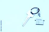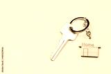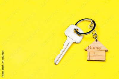Wooden house shaped keychain and key on yellow background. Free space