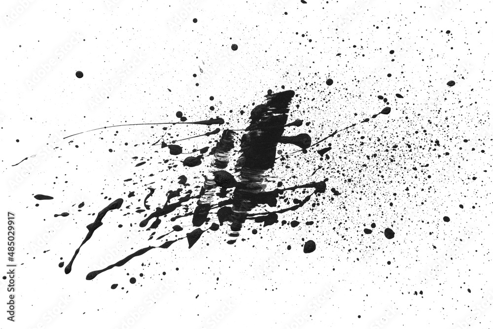 Black brush strokes and paint splashes isolated on white background. Abstract brush strokes texture with blots