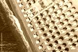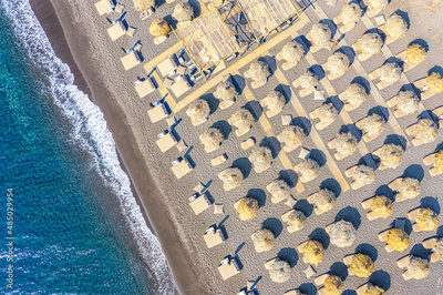 Top view aerial drone photo of black Perissa beach with beautiful turquoise water, sea waves and straw umbrellas. Vacation travel background. Aegean sea, Santorini Island, Greece