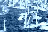 White whooper swans swimming in the nonfreezing winter lake. Altai, Russia