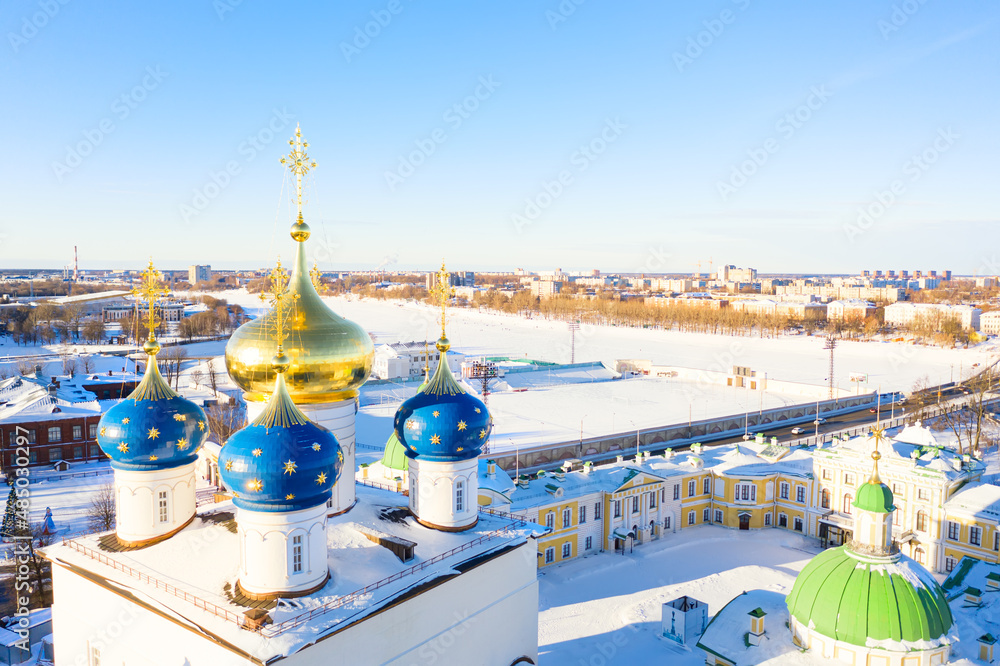 Aerial drone view of Spaso-Preobrazhenskiy transfiguration Cathedral with Volga river in Tver, Russia. Russian winter landscape.