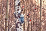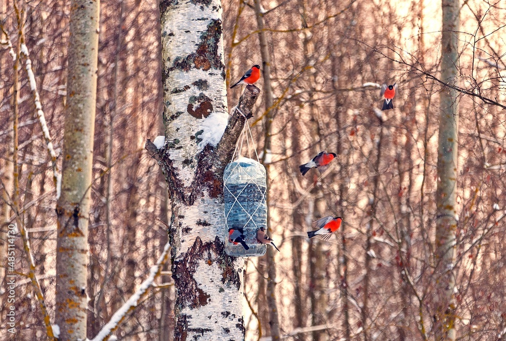 Six bullfinches flew to the feeder with sunflower seeds