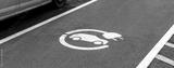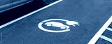 Empty electric vehicle charge station parking spot, marked green zone, car charging device symbol on the asphalt, nobody. Eco, environmentally friendly cars, means of transport, transportation