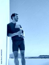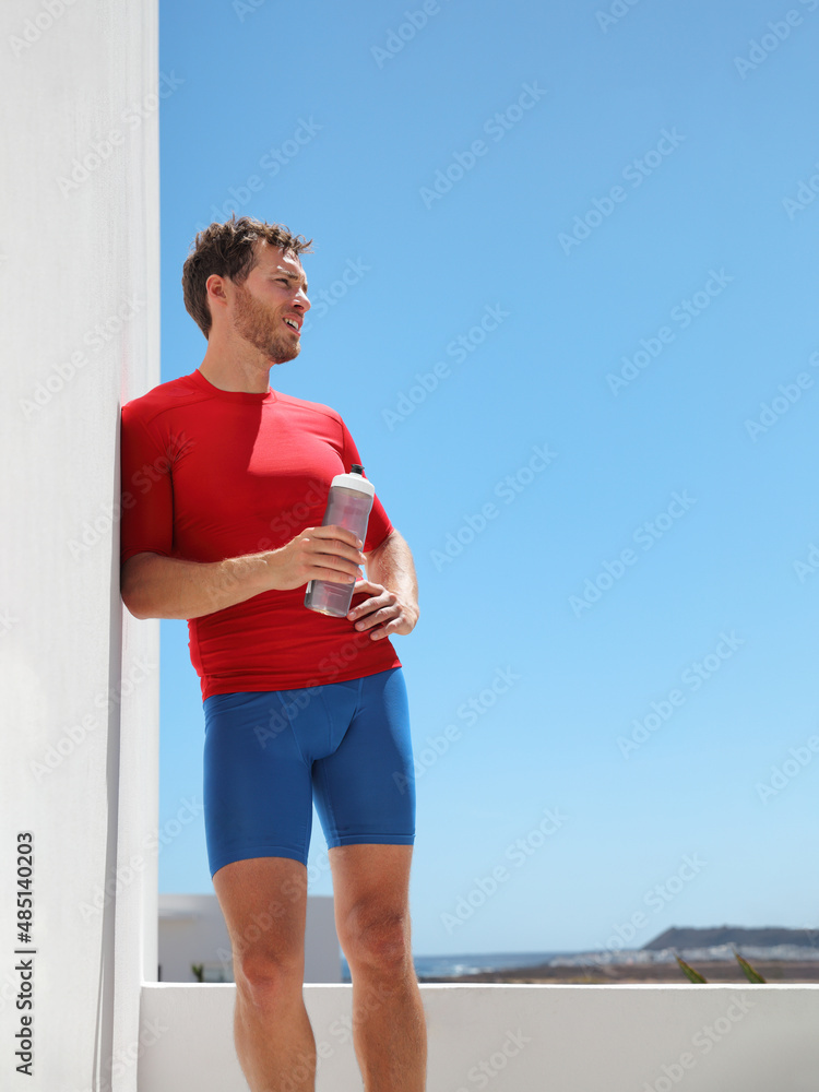 Athlete man runner drinking sports water bottle training at home balcony or outdoor gym exhausted having heat stroke. Vertical crop of muscular body of active people lifestyle