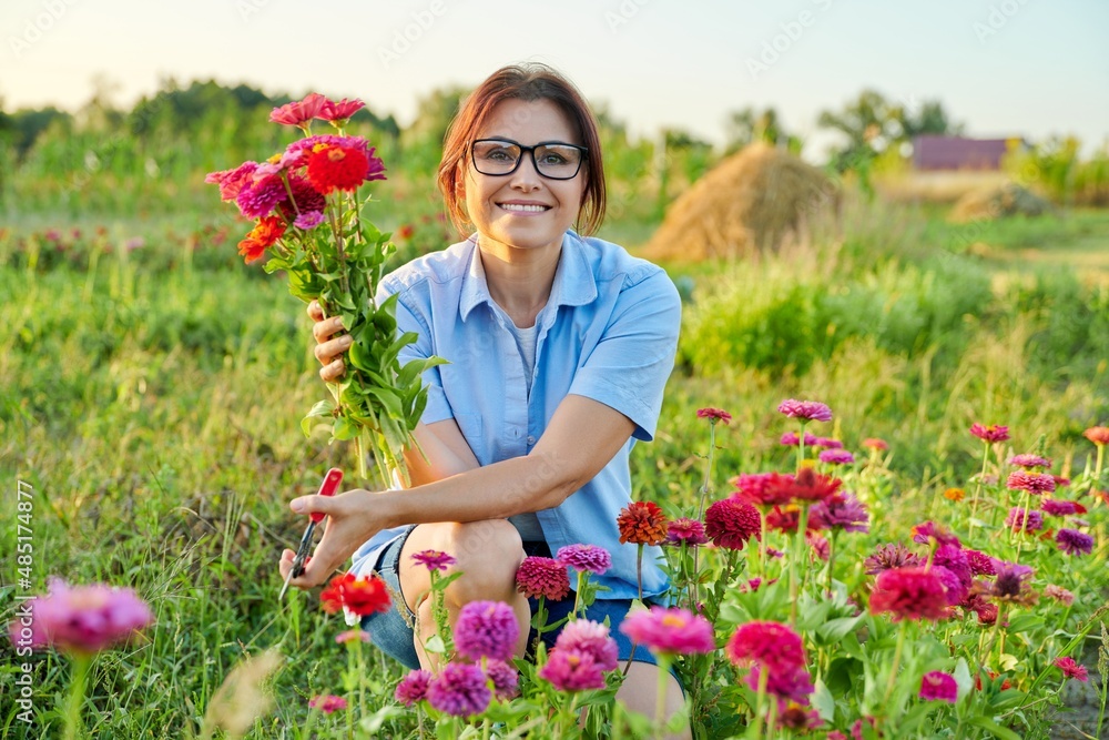 Smiling middle aged female holding bouquet of fresh zinnia flowers in garden