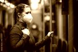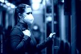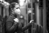 Facial mask concept. A woman wears a mandatory mask inside public transport areas such as a train station, bus and metro. European woman traveler.