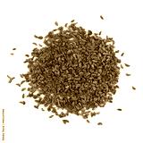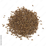 Seeds of parsley isolated on white background. Pile of seeds Petroselinum crispum, top view.
