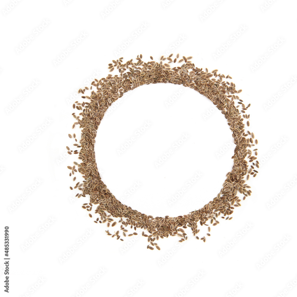 Circle frame of dill seeds isolated on white background. Circle of seeds Anethum graveolens, top view.