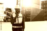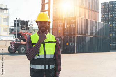 Worker African american in container loading station import export large cargo shipment