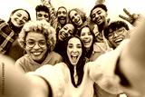 Multiracial friends taking big group selfie shot smiling at camera - Laughing young people standing outdoor and having fun - Cheerful students portrait outside school - Human resources concept