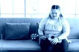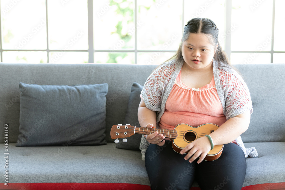 a girl with down syndrome singing and playing ukulele or small guitar on sofa