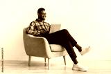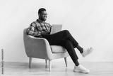 Full length of smiling young black guy with laptop computer sitting in armchair, working online against white studio wall