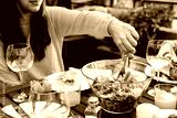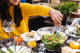 Happy people eating vegan food dinner outdoor at patio restaurant - Focus on african woman hand