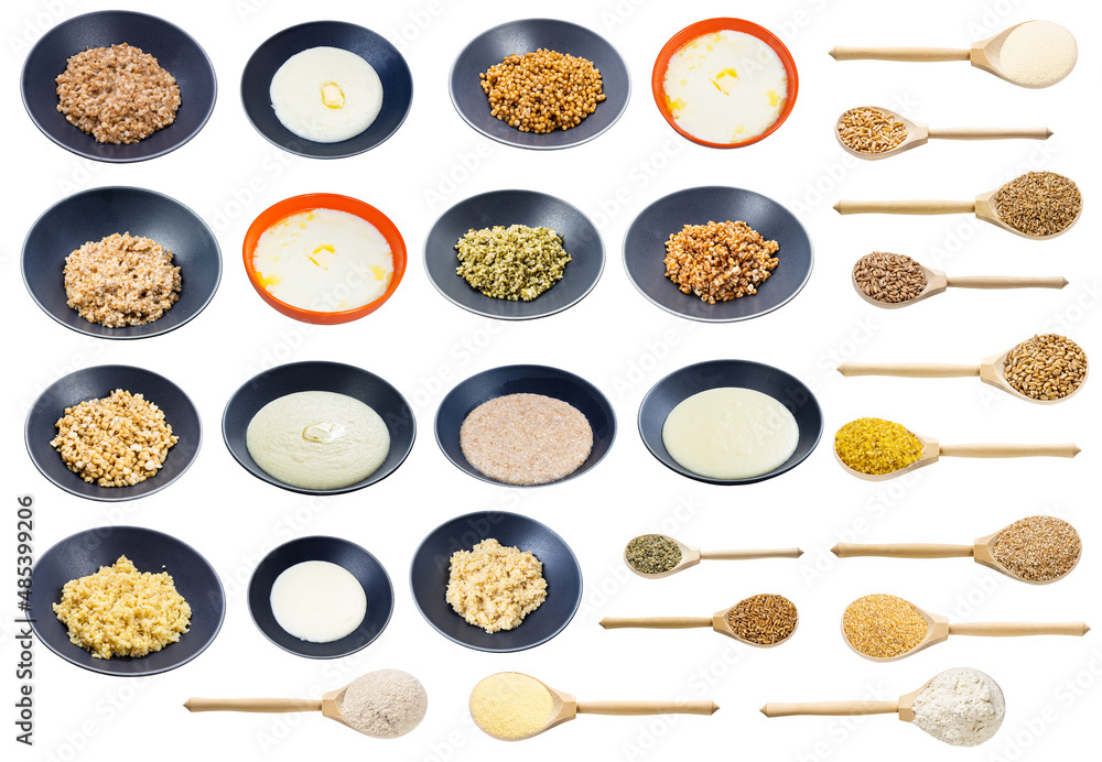 set of various raw and cooked different wheats