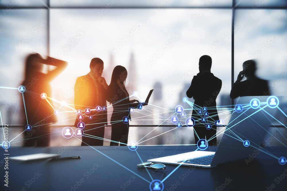 Businesspeople working together in modern office with laptop on desktop and abstract glowing polygonal network with people icons and blurry city view.