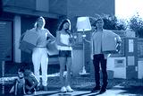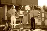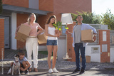 Portrait of happy family in front of new house. Mid adult parents and children holding plant and cardboard boxes, smiling proudly, hugging dog. Real estate, purchase, family concept