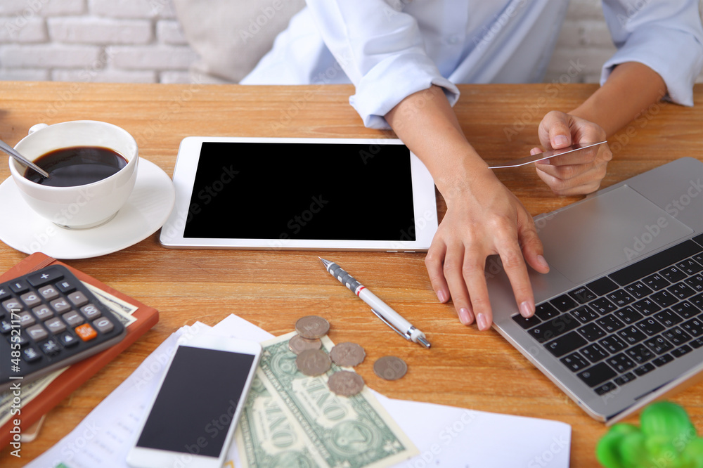 business woman using credit card buy item on ecommerce website