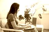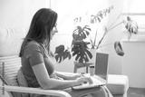 Young woman using laptop working at home online.