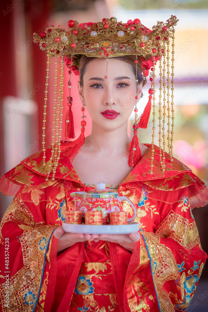 Portrait young beautiful Asian woman wear red cheongsam red.
