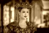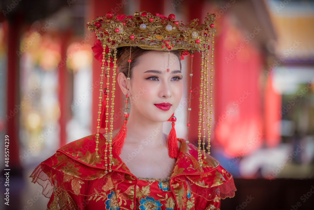 Portrait young beautiful Asian woman wear red cheongsam red.