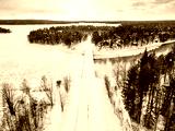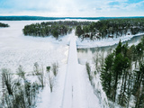 Aerial view of snow winter river with bridge and green forest