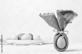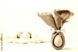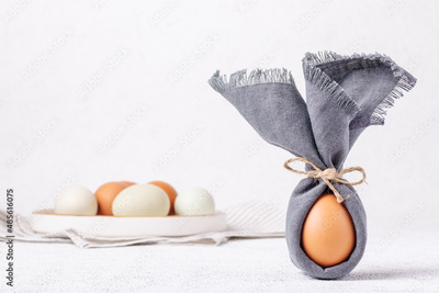 Easter egg decorated with a napkin in the shape of a bunny on a white concrete background