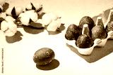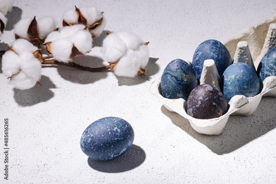 Blue easter eggs dyed with hibiscus tea in an egg carton on a white concrete background