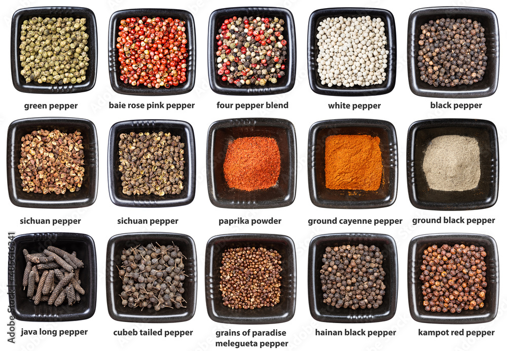 set of black bowls with various peppers with names