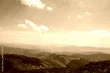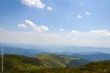 Summer nature landscape with mountain slopes with smooth green grass and forest under blue sky with clouds. Carpathian Mountains, Ukraine