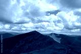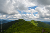 Summer landscape with green mountain slopes covered clouds shadows in Ukrainian Carpathians. Travel and adventure concept