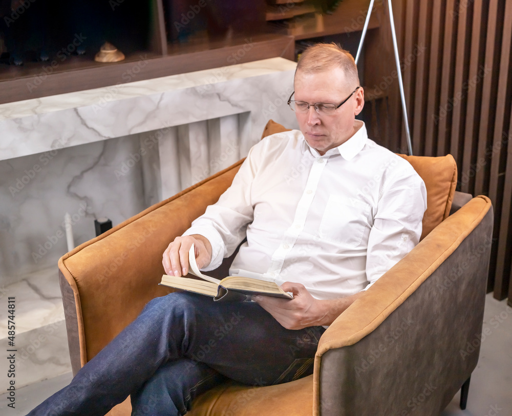 Mature man sitting in armchair and reading book. Business education concept. Reading literature hobby. High quality photo
