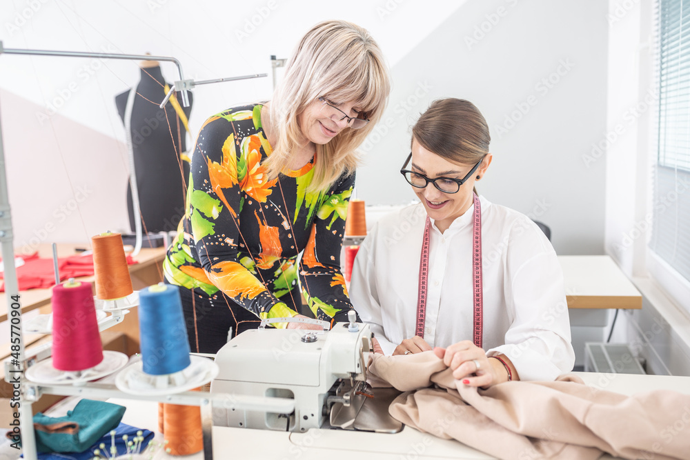 Experiences female tailor shows details of work on clothing to a yound apprentice sitting behind the sewing machine