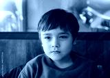 Cinematic portraitPortrait Kid looking deep in thought,Dramatic Young boy sitting alone in coffee shop or cafe waiting for food, A Child looking out with thinking face.