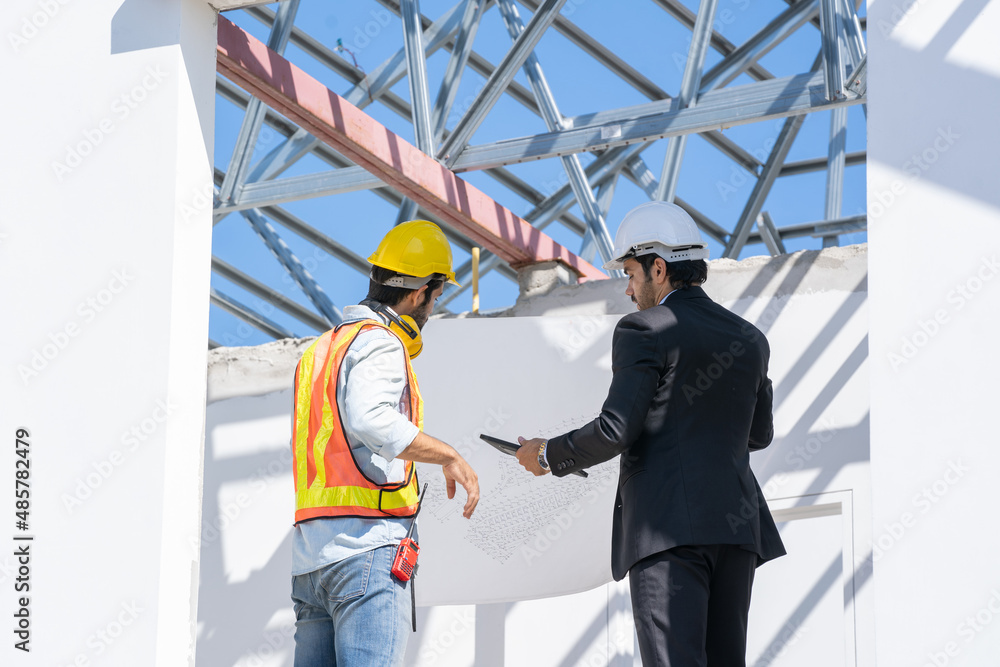 Contractor and engineer inspecting material a building site,New house builder,House improvement concept.