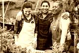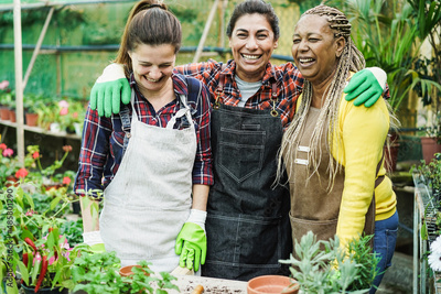 Multiracial women working together inside nursery greenhouse - Green market concept - Main focus on latin woman face