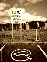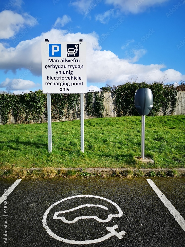 Electric vehicle recharging station in public space. Bilingual sign in English and Welsh languages - in a car park with restrictions on parking in this space to EV vehicles only.
