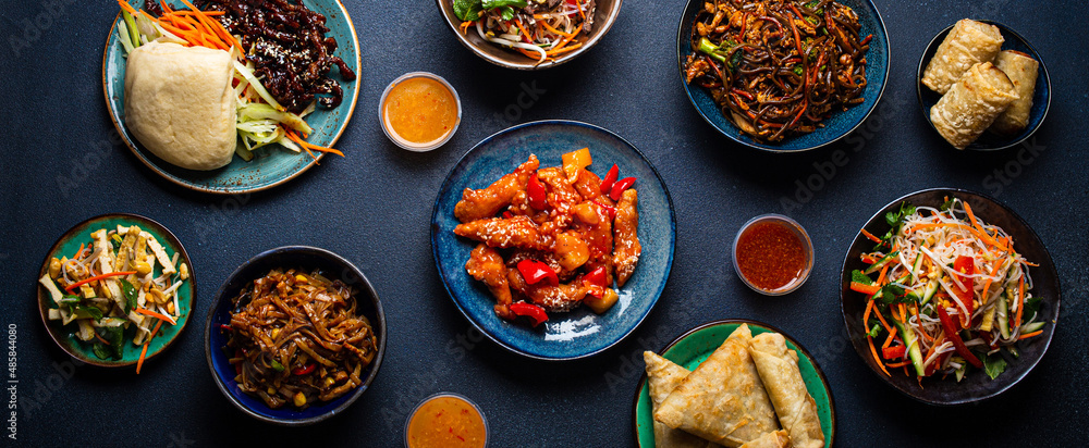 Set of assorted Chinese dishes on table: sweet and sour chicken on plate, fried spring rolls, noodles, salad, rice, steamed buns with bbq glazed pork, Asian style banquet or buffet, top view