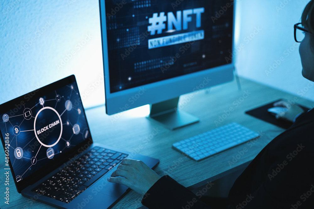 Young woman buying NFT on Blockchain market - New Technology Token Concept - Soft focus on computer screen