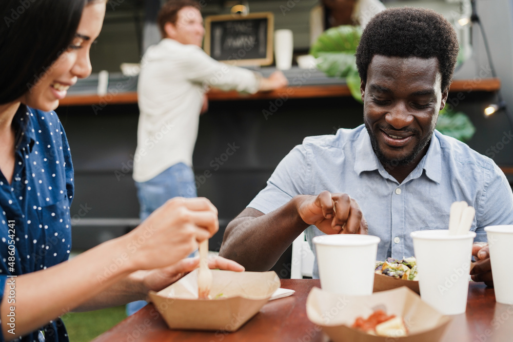 Multiracial couple having fun eating at food truck restaurant outdoor - Focus on african man face