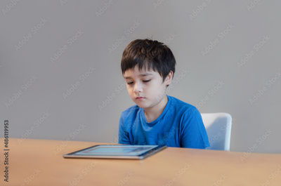 School kid using tablet doing online homework, Child with bored face reading a book on digital reader, Young Boy reading story on e-book, Home schooling , learning online education concept