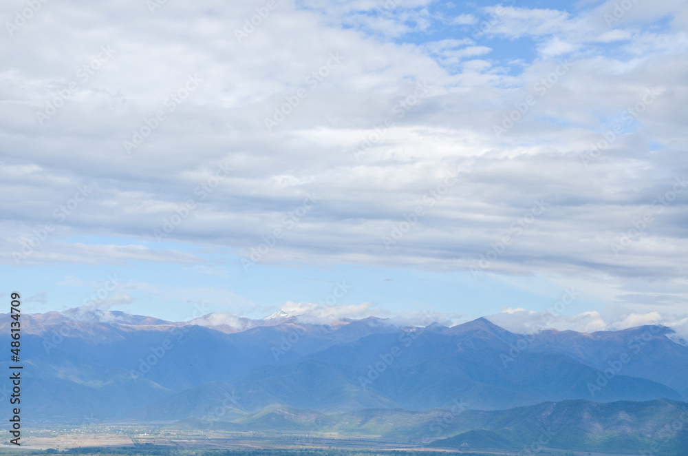 Caucasus great mountain range with snowy peaks under cloudy sky in Telavi, Kakheti region, Georgia