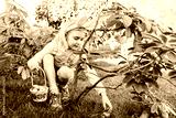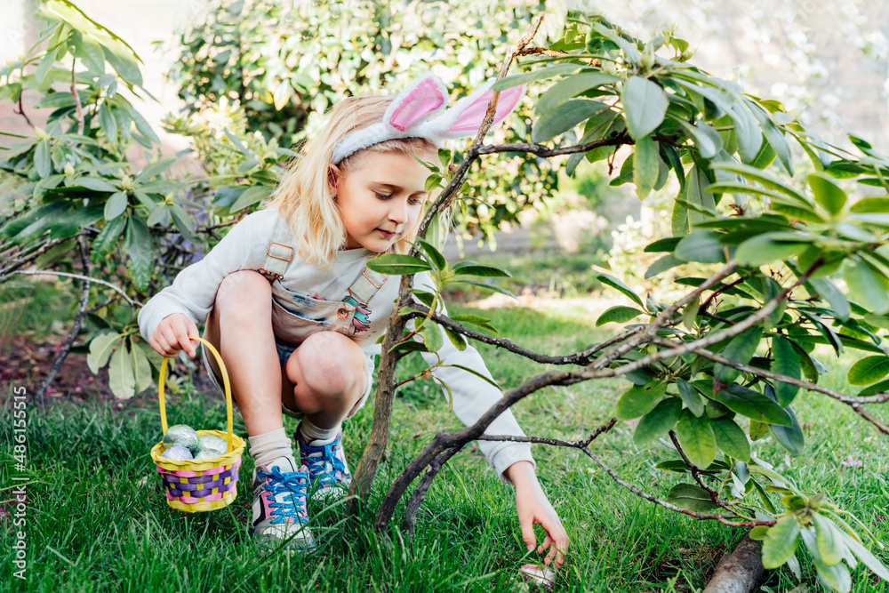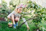 Adorable little girl wearing bunny ears holding a basket with Easter eggs outdoors on spring day. Kid having fun on Easter egg hunt. Children searching for eggs in the garden. Selective focus