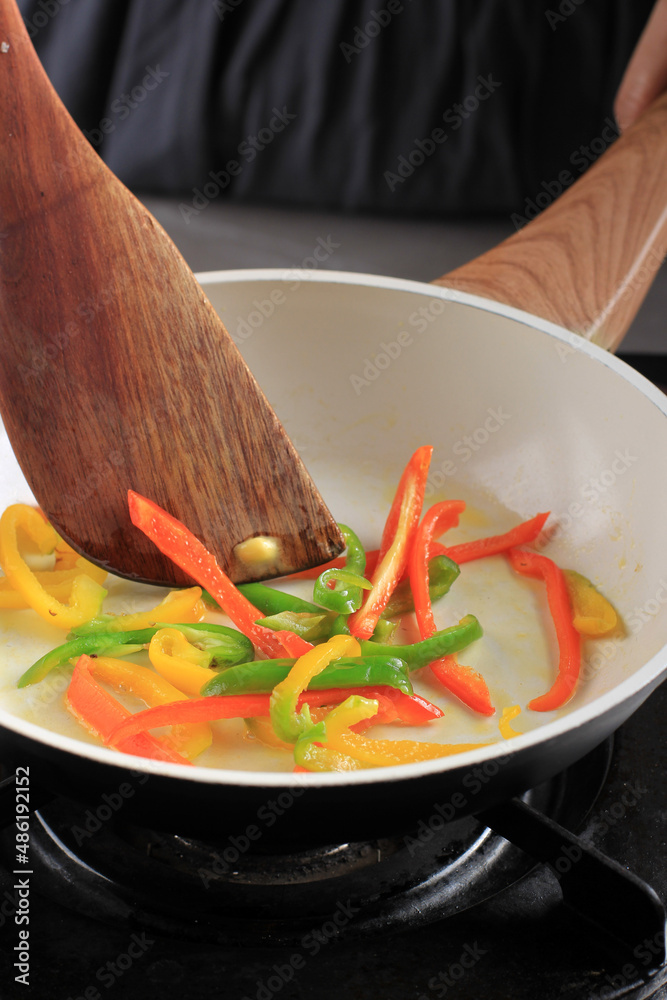 Stir Fry Paprika on Black Pan, Cooking Process in the Kitchen making Delicious Food