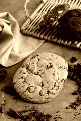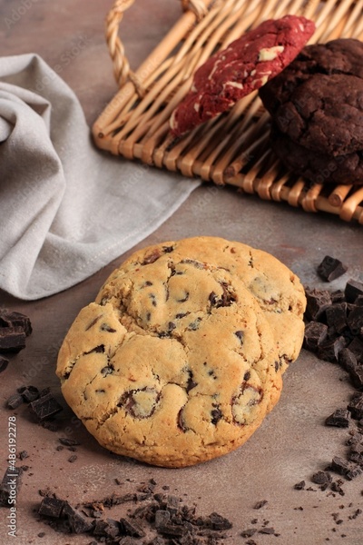 Soft American Dark Chocolate Chips Cookies on Rustic Table.